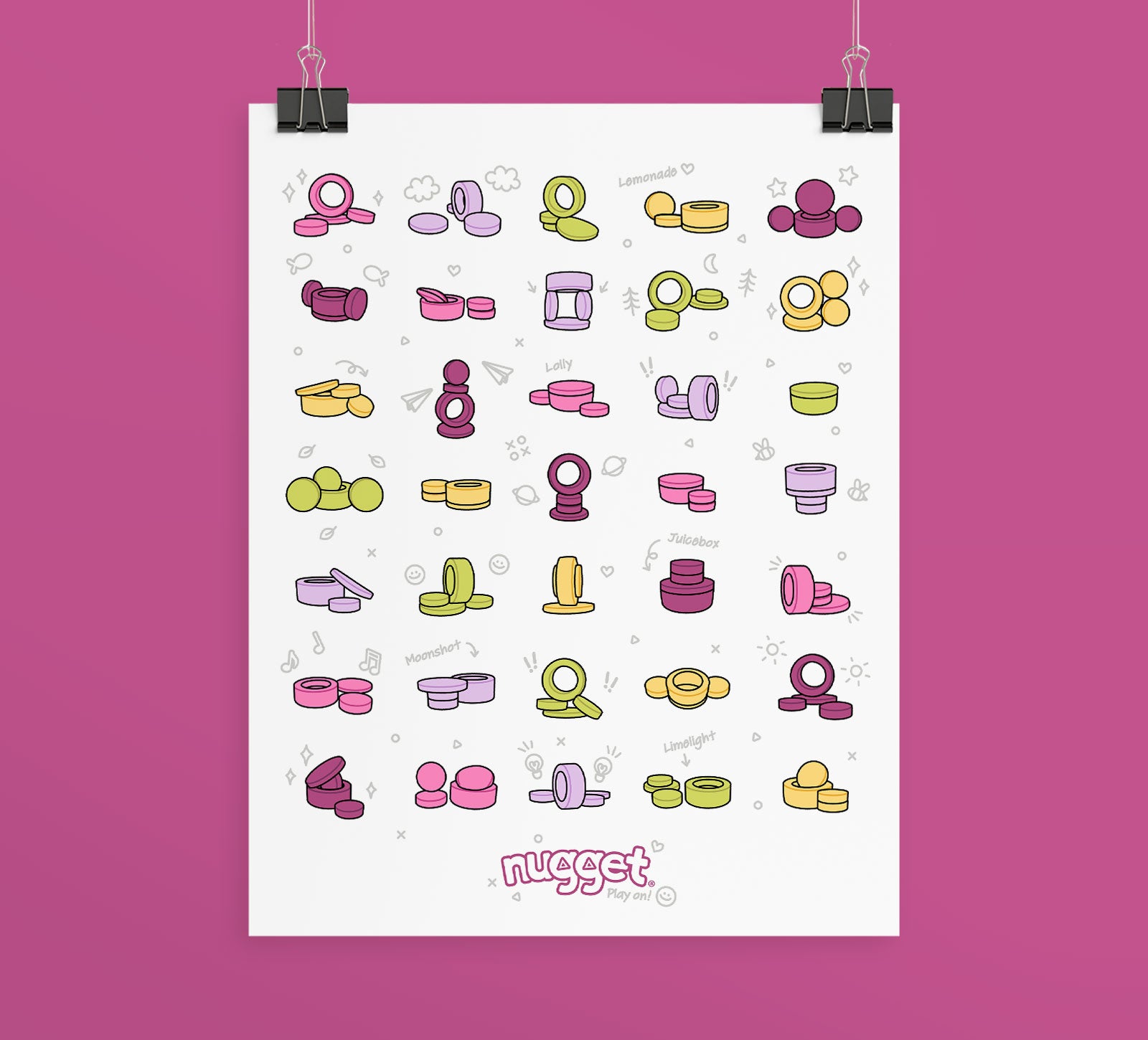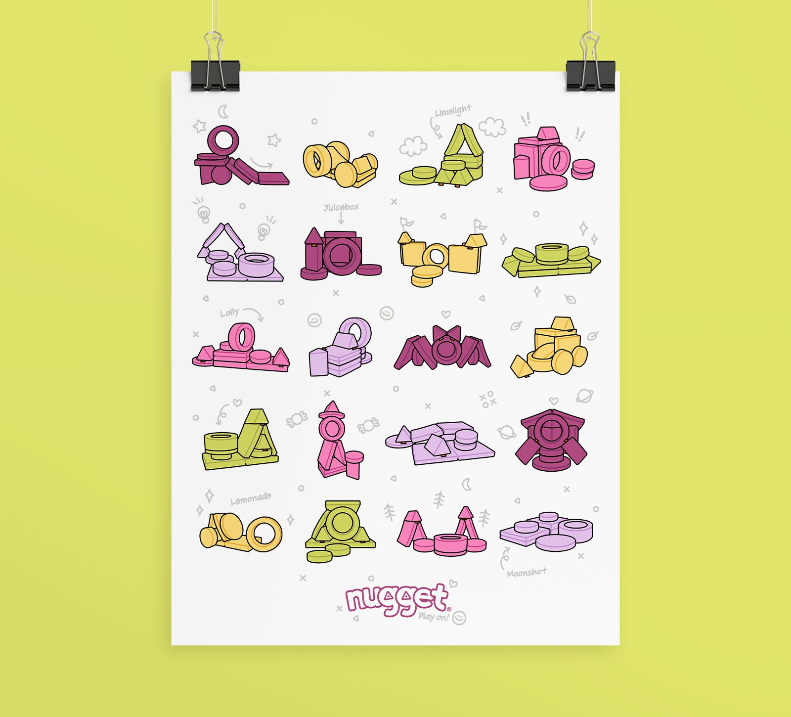 The fun doesn't stop with Nugget® play furniture! Shop fun, colorful, Nuggety art and DIY templates for your playroom to inspire you at playtime. We've got cool designs in all color schemes showing one-Chunk builds, one-Nugget builds, multi-Nugget builds, and one-Chunk plus one-Nugget builds. There's an amazing scavenger hunt print of Nugget HQ, and the ABCs spelled out using Nugget® pieces. All items are digital downloads, so you won't receive any physical items, but your files will be ready to download immediately after purchase. You can print at home or at your local printer! Hang them in your playroom to spark ideas for builds, or submit them to your local museum for consideration in their next exhibit on modern art.