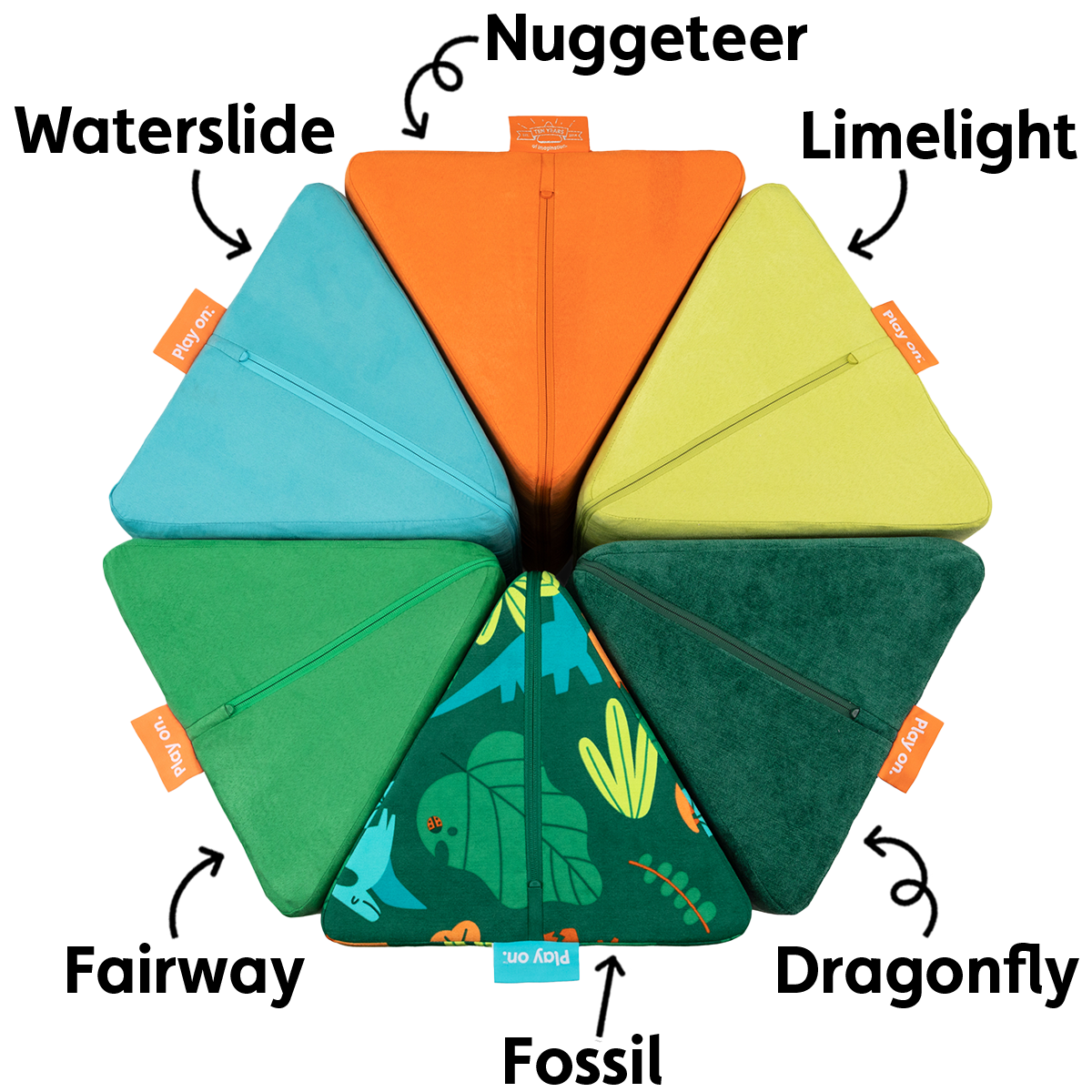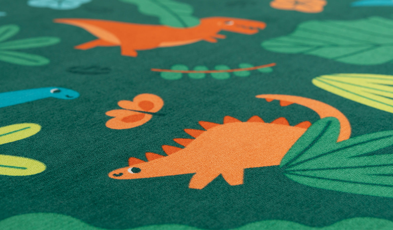 Future paleontologists, welcome to the party… the prehistoric party, that is! Double-brushed Fossil (a Nugget®-original print!) features all your fave dinosaurs on a rich, jungly green that’s closest to retired Dragonfly, though it’s darker and more saturated than Dragonfly. Trek deeper into the adventure, and you’ll spot retired color pals Limelight, Nuggeteer, and Waterslide, as well as the iconic orange of our Nugget packaging!