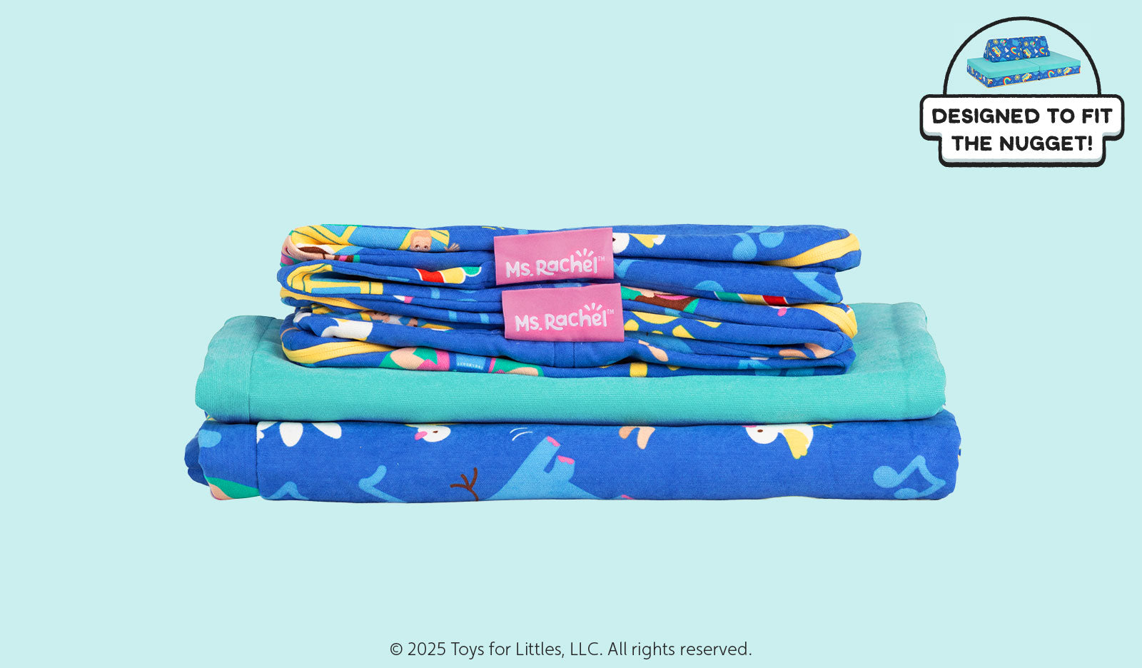 The Ms. Rachel™ Nugget® is inspired by some of Ms. Rachel's favorite sing-along songs! Bold royal blue and soft turquoise are the primary colors of this very special Nugget, accompanied by icons in vibrant shades and with charming details. Compared to Waterslide, Ms. Rachel’s solid cushion is slightly greener. Retired Cactus is slightly lighter and creamier than the Ms. Rachel solid cushion, whereas Atlantis is much bluer and slightly darker. Seamonster has strong gray undertones and is much less bright than the Ms. Rachel cushion.