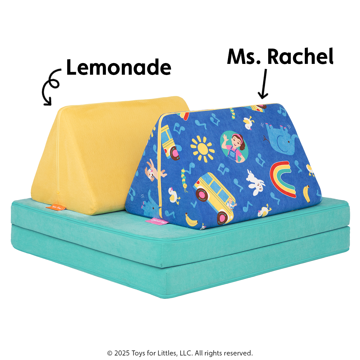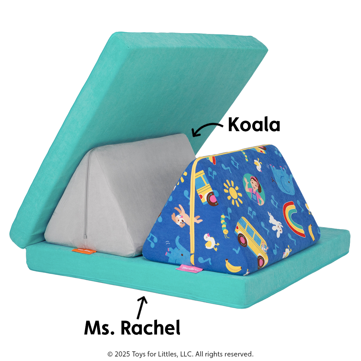 The Ms. Rachel™ Nugget® is inspired by some of Ms. Rachel's favorite sing-along songs! Bold royal blue and soft turquoise are the primary colors of this very special Nugget, accompanied by icons in vibrant shades and with charming details. Compared to Waterslide, Ms. Rachel’s solid cushion is slightly greener. Retired Cactus is slightly lighter and creamier than the Ms. Rachel solid cushion, whereas Atlantis is much bluer and slightly darker. Seamonster has strong gray undertones and is much less bright than the Ms. Rachel cushion.
