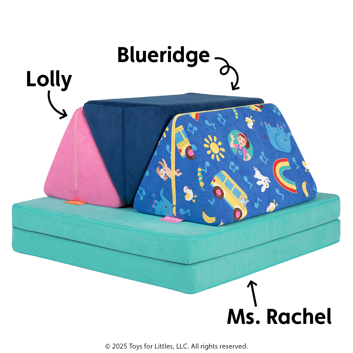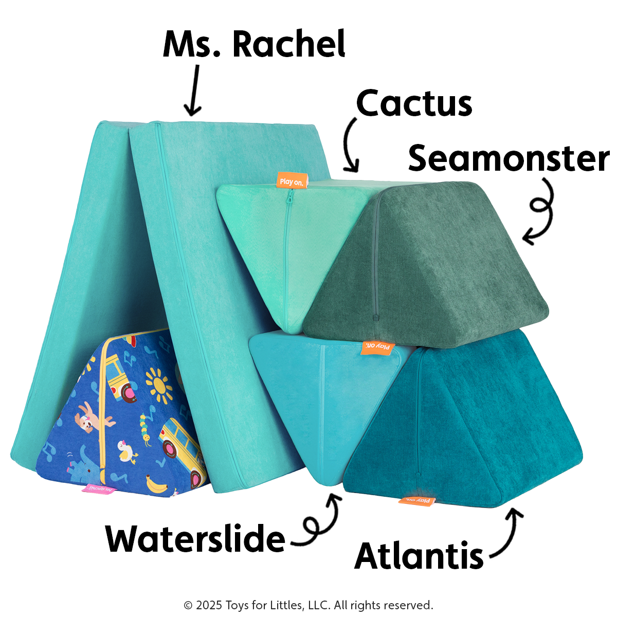 The Ms. Rachel™ Nugget® is inspired by some of Ms. Rachel's favorite sing-along songs! Bold royal blue and soft turquoise are the primary colors of this very special Nugget, accompanied by icons in vibrant shades and with charming details. Compared to Waterslide, Ms. Rachel’s solid cushion is slightly greener. Retired Cactus is slightly lighter and creamier than the Ms. Rachel solid cushion, whereas Atlantis is much bluer and slightly darker. Seamonster has strong gray undertones and is much less bright than the Ms. Rachel cushion.