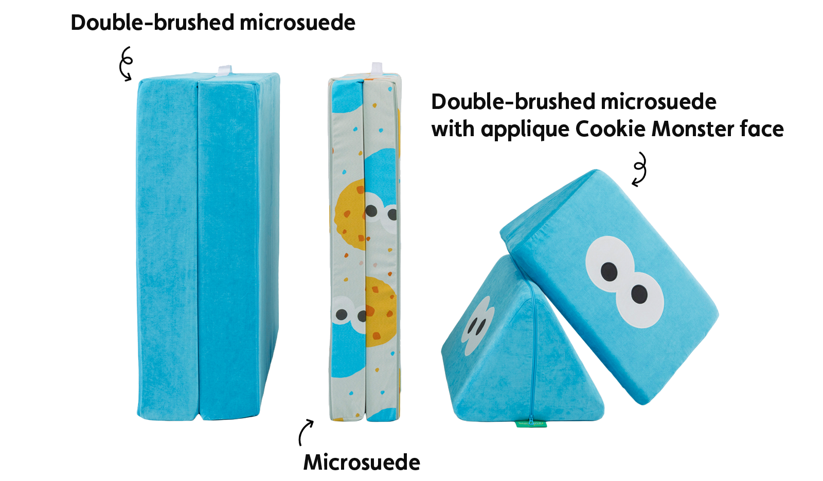 The Nugget features two fabrics – our regular microsuede on the patterned thin cushion and double-brushed microsuede on the blue thick base and pillows. These two fabrics work perfectly together, like peanut butter and jelly, or cookies and milk (we had to). Each pillow has one applique Cookie Monster face.