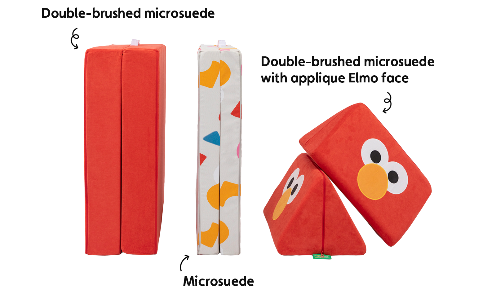 The patterned thin cushion is cloaked in our regular microsuede, the super soft and durable fabric we love to work with. The red thick base and pillows are covered with our luxe and ultra-comfortable double-brushed microsuede, and each pillow has one applique Elmo face.