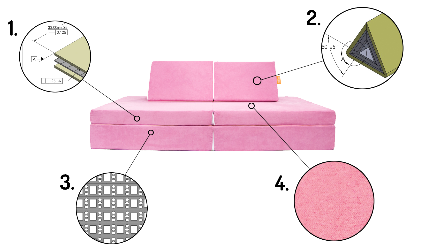 We swapped out the white backing on the Cover Sets for black backing, and we changed the foam from white to gray. We also updated the zipper pull and zipper tape to increase strength. Ultimately, all these changes helped increase durability for active play!