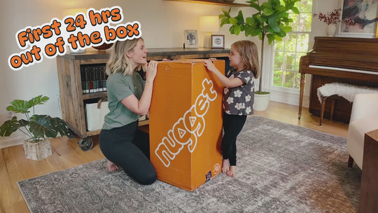 The Nugget® can be stored in its box for up to eight weeks after delivery. Since it travels to you tightly compressed, it may take slightly longer to fluff up to form if it’s left in the box for a bit, but it will still be ready for play right away. Playing with the Nugget® helps it find its shape — and helps Nuggeteers get right to the fun!